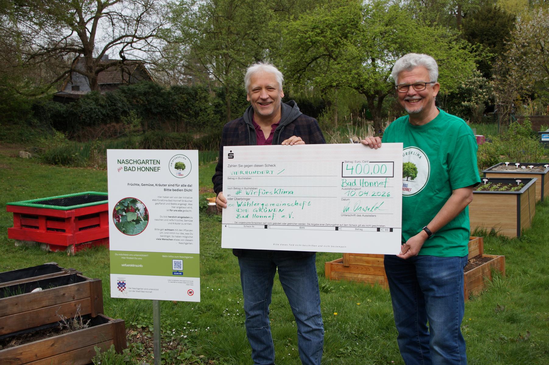 Spendenübergabe WG Grüne an Wirfürsklima — Foto© Thomas Scheben — AusBadHonnef.de — (2) Michael Oswald von der WG Grüne Bad Honnef (li) überreicht einen Spendenscheck an Guido Düren von #WirfürsKlima — Foto© Thomas Scheben