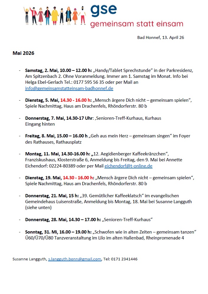 Hier die Termine GSE – Geminsam statt einsam – Mai 2026