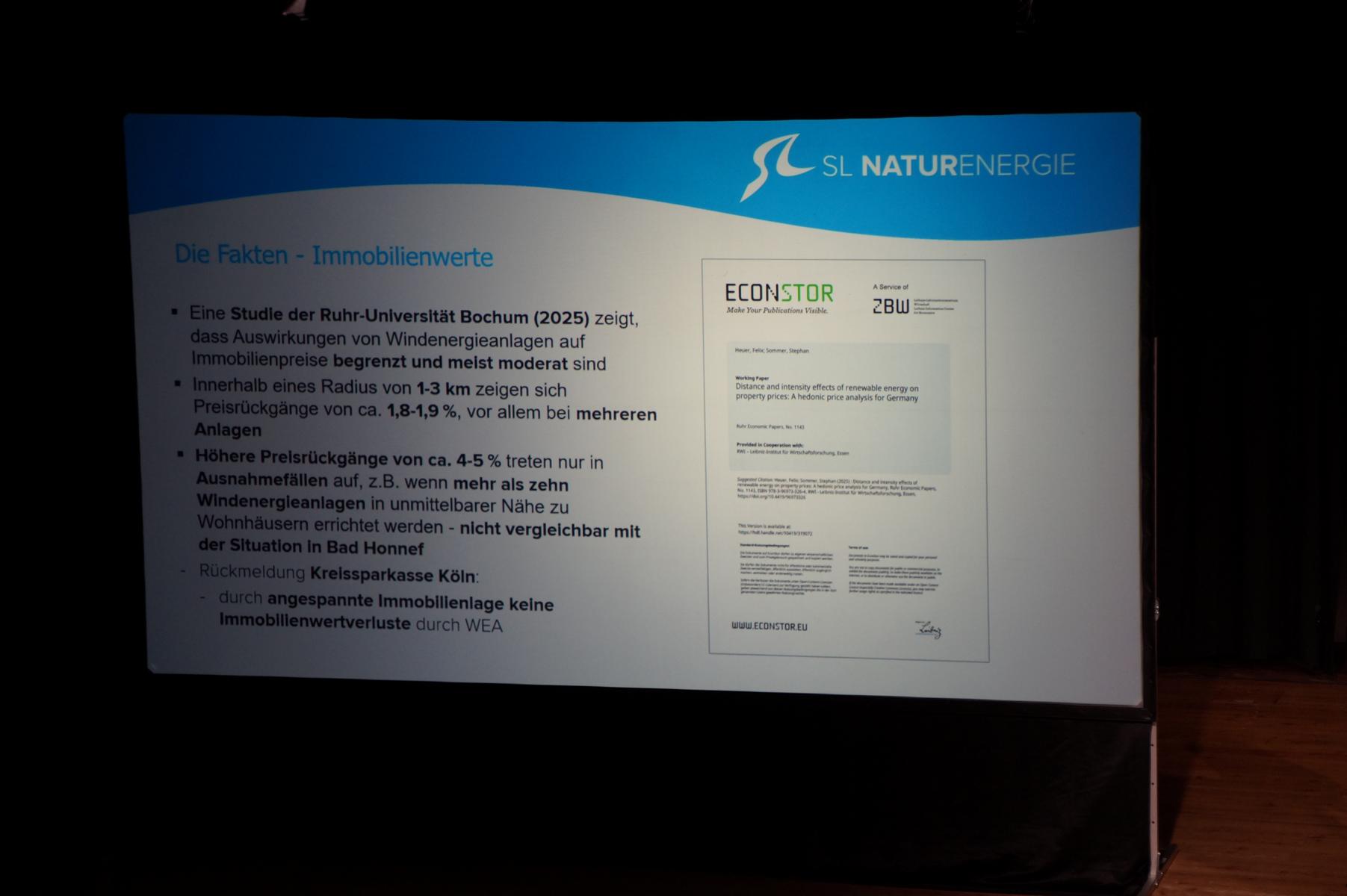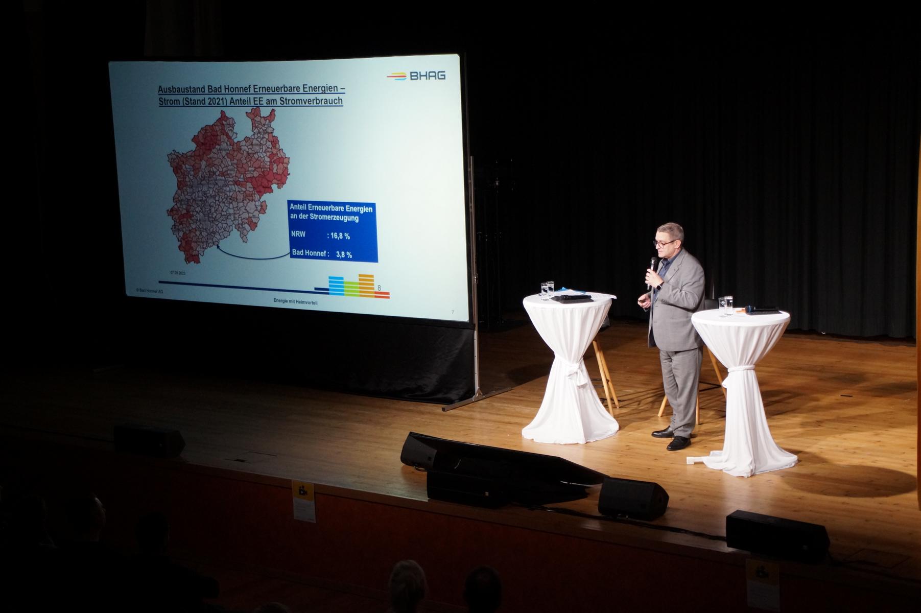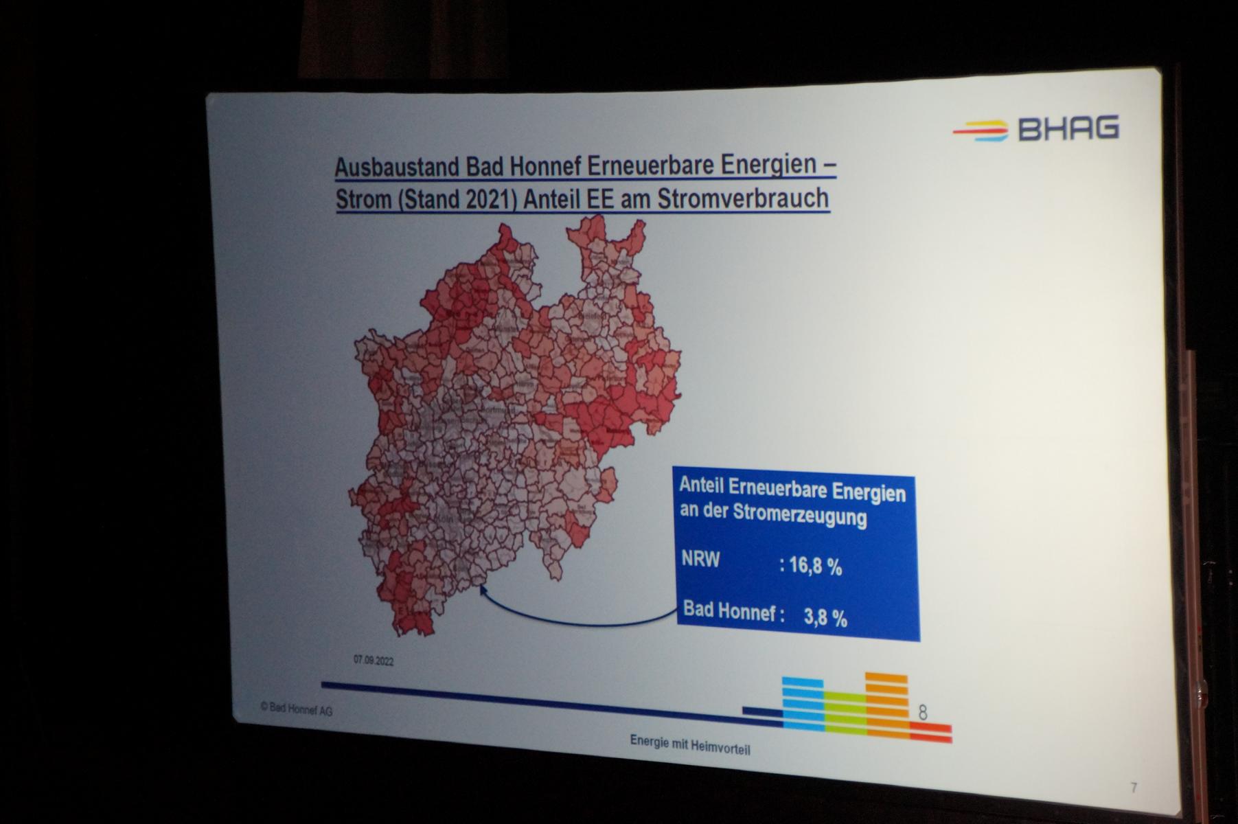 BHAG‑Vorstand Kersten Kerl sowie Michael Hübner, Prokurist der SL Naturenergie und Jakob Kasperidus,Sonderprojete SL Naturenergie, erläuterten anschließend, dass das Verfahren noch nicht abgeschlossen sei. Gleichzeitig machten sie deutlich, dass Bad Honnef beim Ausbau erneuerbarer Energien zurückliege: Während in Nordrhein‑Westfalen rund 16,8 Prozent des Stroms aus erneuerbaren Quellen stammen, seien es in Bad Honnef lediglich 3,8 Prozent.