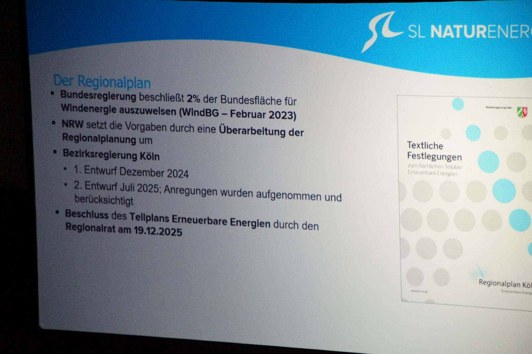 Als Grundlage für die aktuellen Planungen nannten die Referenten das Windenergieflächenbedarfsgesetz (WindBG) von 2022, das vorsieht, dass 2 Prozent der Bundesfläche für Windkraft bereitgestellt werden sollen. Zudem orientiere man sich am Regionalplan Köln, der entsprechende Potenzialflächen für die Windenergienutzung ausweist.