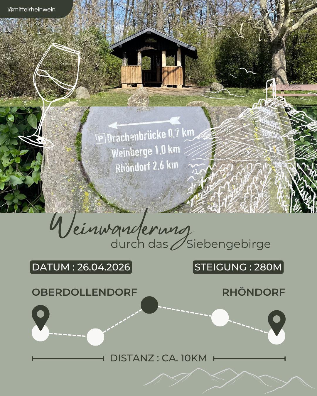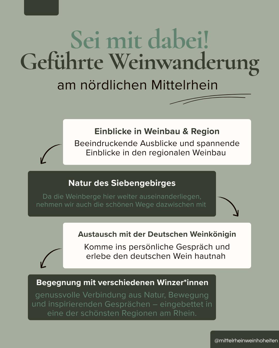 Die Mittelrheinweinhoheiten Janina, Jill und Anna laden am 26. April 2026 10 Uhr zu einer Weinwanderung im Siebengebirge ein. Die Veranstaltung findet im Rahmen ihrer Tätigkeit als Repräsentantinnen der Mittelrhein‑Weinregion statt und richtet sich an interessierte Weinfreunde aus der Region.