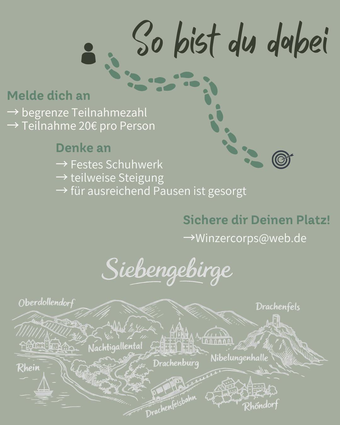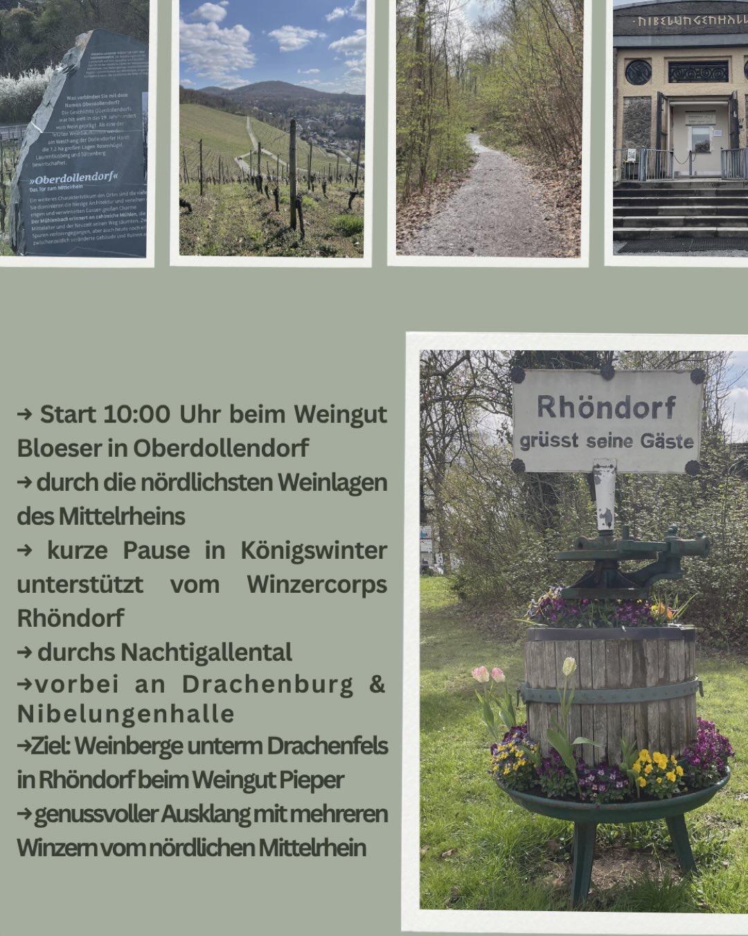 Auf der rund zehn Kilometer langen Strecke möchten die Weinhoheiten das Siebengebirge gemeinsam mit den Teilnehmenden erkunden und Einblicke in die Weinlandschaft des nördlichen Mittelrheins geben. Mehrere Winzerbetriebe begleiten die Tour und bieten unterwegs kleine Snacks und Getränke an.