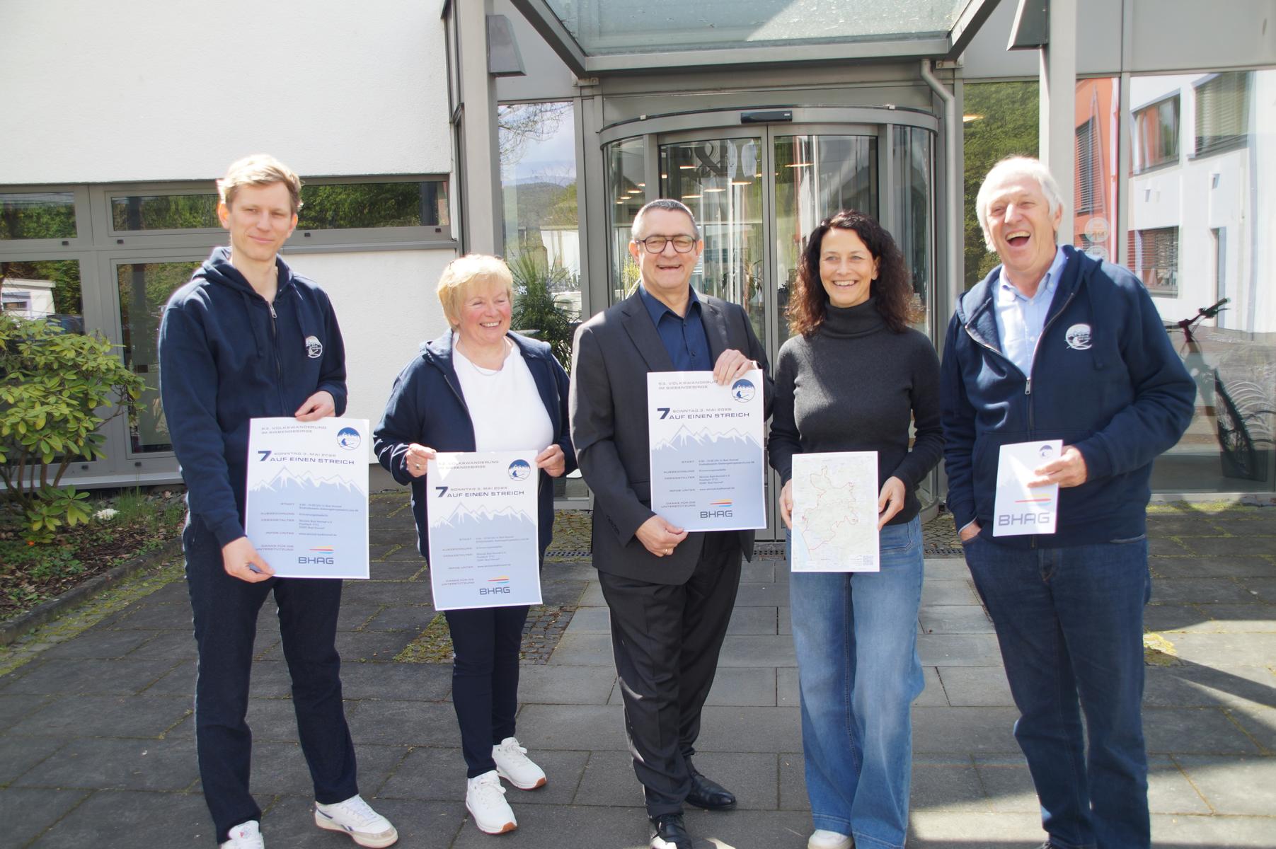 Vorstellung des 53. Volkswanderung 7 auf einen Streich — v.l. Lukas Korthhaus, Gisela Todaro (Skiclub), Kersten Kerl (Vorstand Bhag) Daniela Paffhausen (Bhag) und Matthias Hupperich (Skiclub Bad Honnef) — Foto:©Thomas Scheben