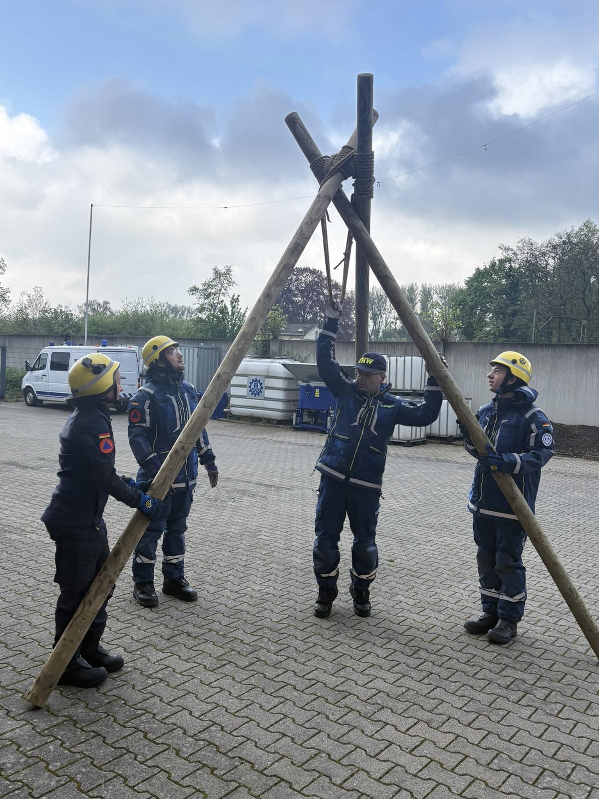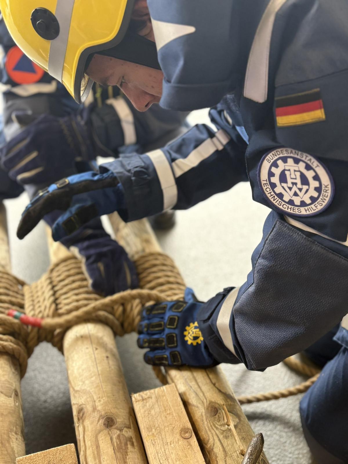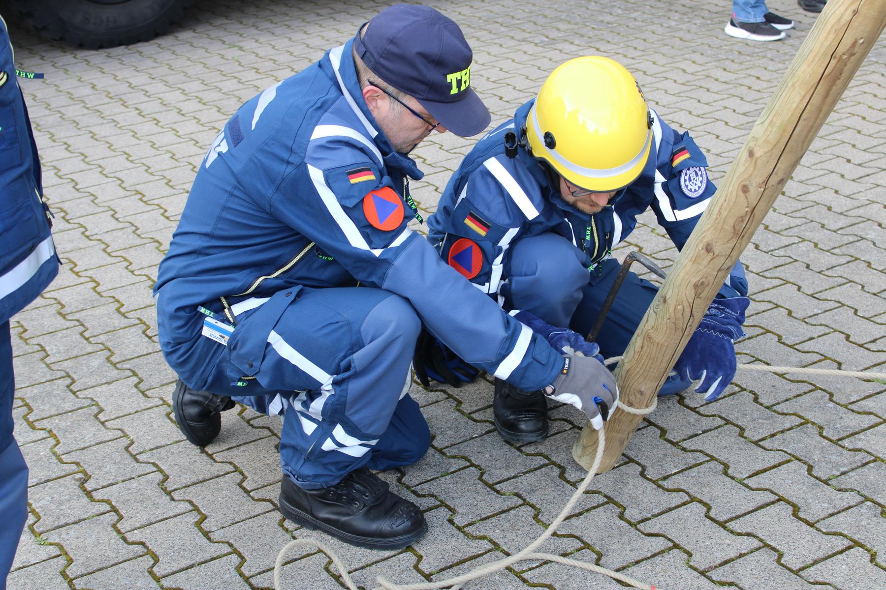 Die THW Helferanwärter zeigten, wie ein Dreibockbund gemacht wird und wofür dieser eingesetzt wird, eine Hilfskonstruktion, die verschiedenst eingesetzt werden kann. Am jeweiligen Einsatzort aufgestellt, kann der Dreibock dann mit zusätzlichen Geräten ausgestattet werden, zum Beispiel mit einer Umlenkrolle für den Seilbahnbetrieb. Auch zum Tragen von Versorgungsleitungen, Auf- und Ablassen von Personen und beim Bau von Hängestegen kommt der Dreibock zum Einsatz. Je nach Bauweise beträgt die maximale Last 4000 kg!