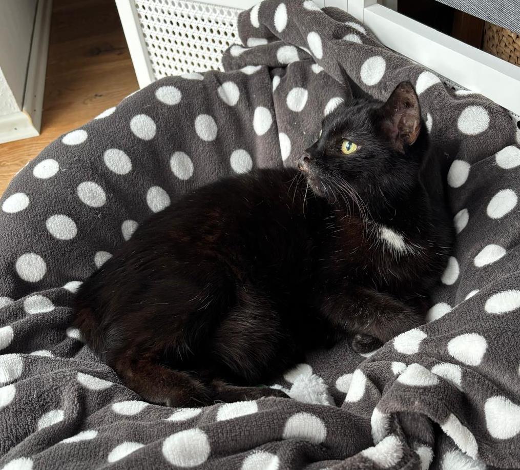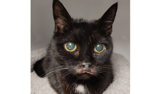 Im Herbst 2025 irrte die ca. 8 Jahre alte Katze Odessa in der Nähe des Orscheider Tierschutzhofes in Bad Honnef-Orscheid umher und sie wurde vom Katzenversorger-Team aufgegriffen. Ihr Allgemeinzustand war besorgniserregend, weshalb sie schnellstens beim Tierarzt vorstellig wurde. Dort stellte man fest, dass Odessa blind und taub ist; zudem hatte sie einen dramatisch angeschwollenen, blutigen Oberkiefer. Dank der medikamentösen Einstellung, ging es der tapferen Kätzin bald besser. Der Oberkiefer ist abgeschwollen und es sieht ein wenig so aus, als hätte Odessa einen kleinen Schnabel. Mittlerweile lebt das Handicap-Kätzchen in einer Pflegestelle, wo sie die Aufmerksamkeit und Ruhe bekommt, die sie so dringend braucht und diesen Einzelprinzessinnen-Platz, genießt Odessa sehr. Das Pflegefrauchen beschreibt sie als eine wundervolle, liebenswerte Katze die gelernt hat, mit ihren Einschränkungen klar zu kommen, wenn es keine großartigen Veränderungen im Wohnumfeld gibt. Außerdem hat sie einen gesunden Appetit und nimmt ihre Medikamente (2 Tabeltten täglich) sehr gern in einer Leckerli-Stange.